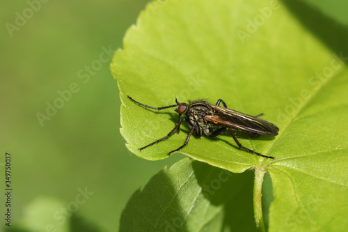 Fototapeta premium A hunting Dagger Fly, Empis tessellata, perching on a leaf in spring.
