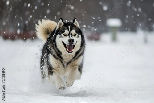 © ABF_MATEO, Naklejka premium A husky dog joyfully bounds through a snowy landscape, its fur glistening under a flurry of snowflakes. Pure winter wonderland energy!