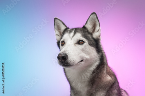 © Ирина Андрианова, Obraz premium A Husky dog on a soft pink background. Studio photoshoot. Looking at the camera