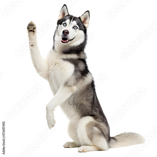 © CHAOURRI, Fototapeta premium A husky dog sitting on its hind legs with its paw raised against a black background in a studio shot