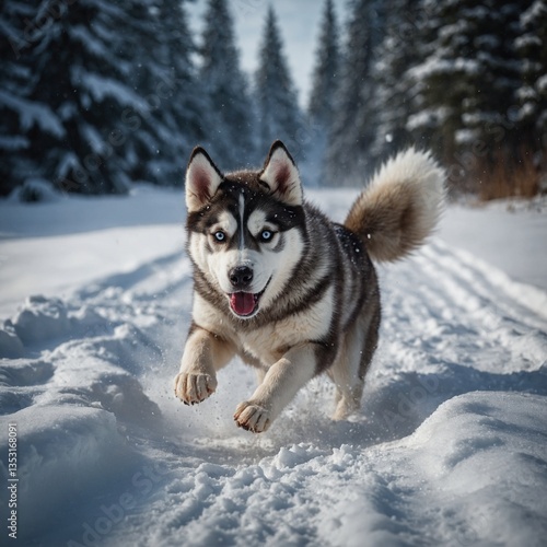 © Asad, Naklejka premium A husky puppy following its mother through the snow.