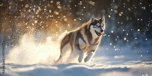 Naklejka premium A Husky running joyfully in snowy field with falling snowflakes and sunlight.