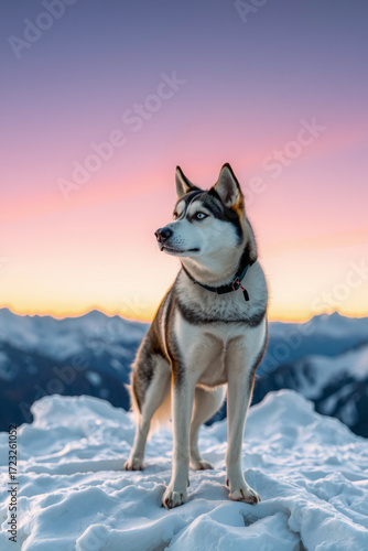 Fototapeta premium A husky standing at dawn atop a frost peak