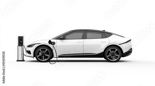 Fototapeta premium A hybrid electric vehicle plugged into a charging station, isolated on a crisp white background.