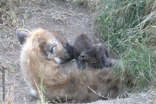 Obraz premium A hyena cub playing with its mother