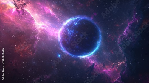 Fototapeta premium A hyper-detailed nebula ring encircles a distant planet, glowing with neon-colored cosmic energy