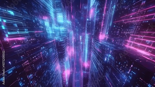 Fototapeta premium A hyper-futuristic cityscape with glowing skyscrapers and flowing digital lines across the sky, blending surreal colors of neon blue and pink, with layers of holographic advertisements illuminating