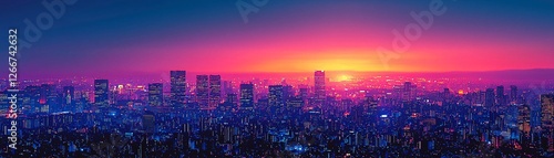 © Achirawee, Fototapeta premium A hyper-realistic city skyline at twilight, blending infrared film photography with digital double exposure, surreal yet authentic, deep contrast, striking colors, dreamlike ambiance