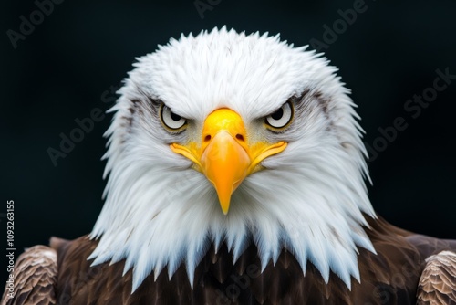 © Thanyarat, Fototapeta premium A hyper-realistic close-up of an American eagle’s face, showcasing every feather and the sharpness of its piercing eyes