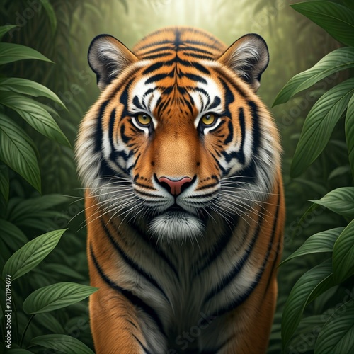 Fototapeta premium A hyper-realistic image of a tiger prowling through a dense jungle, with...