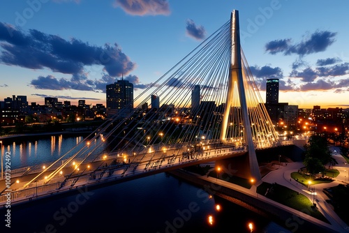 © Thanyarat, Fototapeta premium A hyper-realistic image of an urban bridge at sunset, where the cables, steel, and lights are captured in vivid detail, highlighting the scale and precision of city infrastructure.