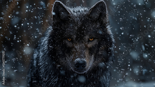Naklejka premium A hyper-realistic wolf with thick, detailed fur, standing in the middle of a fierce snowstorm.