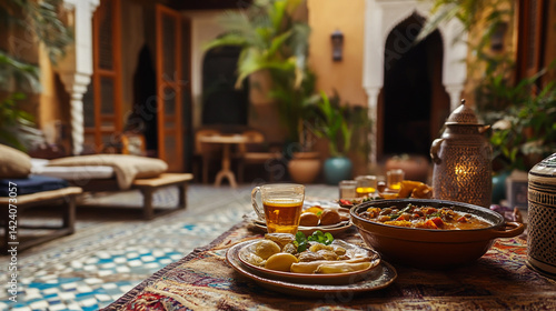 Naklejka premium A iftar scene with tajine and mint tea in a riad courtyard.