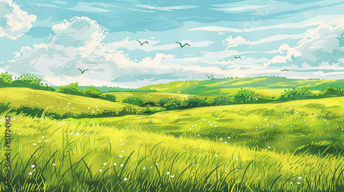 © Aisyaqilumar, Obraz premium A illustration of a green grass field with a blue sky and clouds.