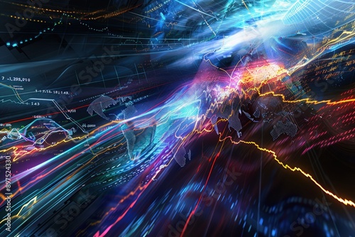 © NUSRAT ART, Fototapeta premium a?'imagine: Abstract depiction of global stocks and technology, vibrant lightning streaks symbolizing international market trends.