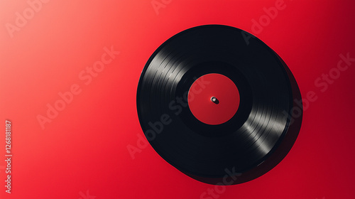 © Ashgan, Obraz premium A 12-inch black vinyl LP record is a large, analog music disc housed in a cardboard cover, featuring grooves that store audio isolated on red background