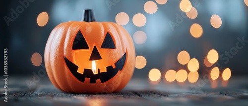 © Wall, Naklejka premium A Jack O' Lantern atop a table against a hazy backdrop of twinkling lights
