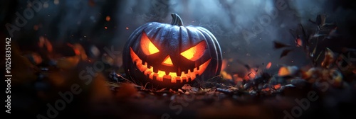 © Viktor, Fototapeta premium A jack-o-lantern pumpkin glows in the dark, leaves scattered on the ground in the foreground