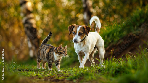 © Flowal93, Obraz premium A jack russell terrier dog and a cat walking together through a forest