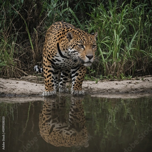 © Batool, Obraz premium A jaguar and an ocelot meeting near a white sandy river.
