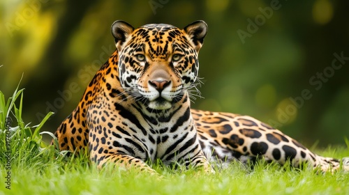 © Imron, Obraz premium A jaguar is seen sitting in the grass seemingly waiting for prey