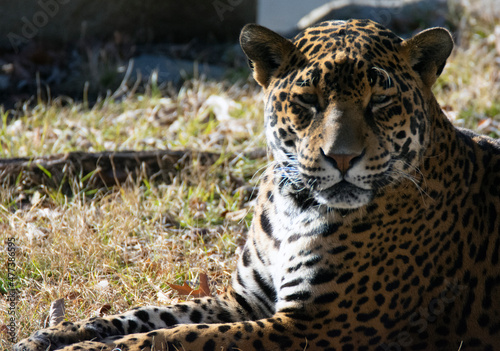 © Amanda, Obraz premium A jaguar lays on the grass.