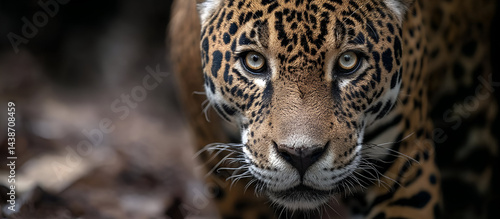 Obraz premium A jaguar pausing in its tracks, its gaze fixed on something in the distance, captured in HD from a frontal angle with intense focus