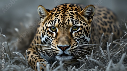 © fuwen, Obraz premium A jaguar sitting in grass during winter.