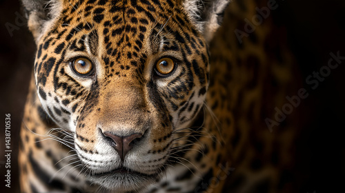 Obraz premium A jaguar staring directly into the camera lens, its intense gaze captivating,...