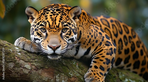 Obraz premium A jaguar with a spotted coat lies on a tree branch, looking directly at the...