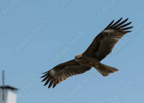 Obraz premium A Japanese black kite bird flying and hovering in the sky.