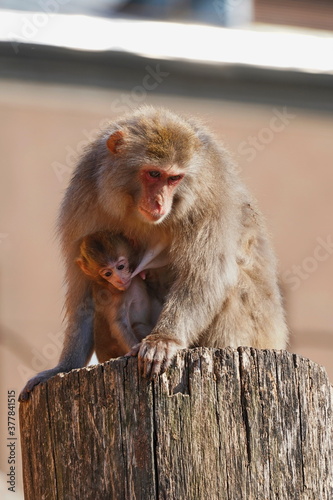 Naklejka premium A Japanese macaque sits on a tree with a baby.