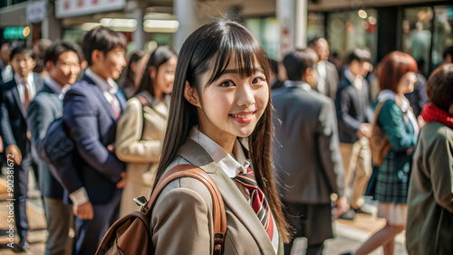 © Big, Fototapeta premium A Japanese school girl is walking in front of a train station. She turns and smiles at the camera