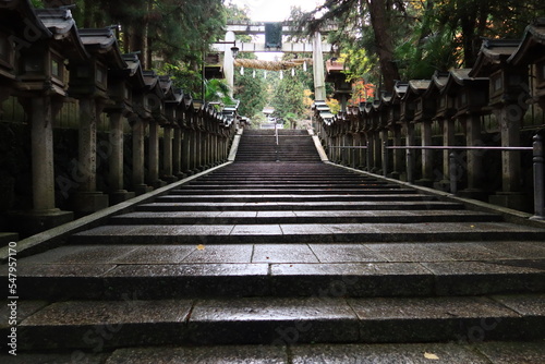 © SAGURI YUKIO, Obraz premium A Japanese temple : a scene of the access to the precincts of Hozan-ji Temple before dark in Ikoma City in Nara Prefecture 日本のお寺:奈良県生駒市の宝山寺の境内への参道の日暮れ前の風景