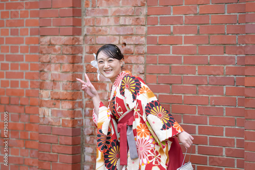 © Masakazu Tokashiki, Fototapeta premium A Japanese woman in her 20s, wearing a red hakama, a staple of Japanese university graduates, poses against a cultural brick building.