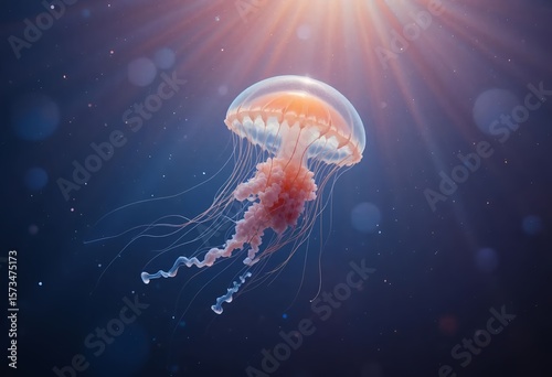 © Yurii, Fototapeta premium A jellyfish drifting in open Red Sea water, transparent body catching light rays, minimalistic clear composition.