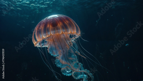 Naklejka premium A jellyfish swims in the deep blue ocean, illuminated by a beam of light from...