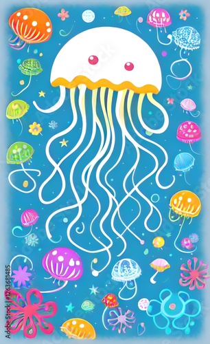 © Nataly Art, Fototapeta premium a jellyfish with many different colors and sizes of jellyfishs around it,