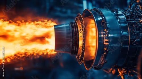 © florynstudio3, Obraz premium A jet engine nozzle emitting a vibrant, fiery exhaust, showcasing the power and engineering behind modern aviation technology.