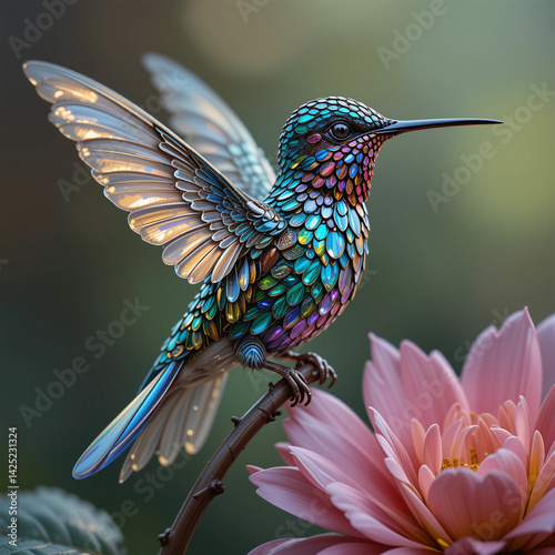 © Anucha, Obraz premium A jeweled hummingbird, iridescent feathers, perched on a flower.