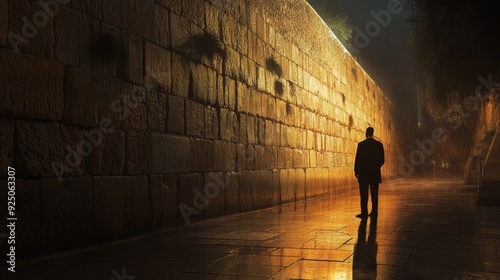 © Darya, Naklejka premium A Jewish man stands still beside the Western Wall, embracing the tranquility of the evening as soft light illuminates the historic stones