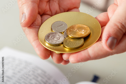 Fototapeta premium A Jewish woman performs pre-wedding rituals with silver shekels for a secure life.