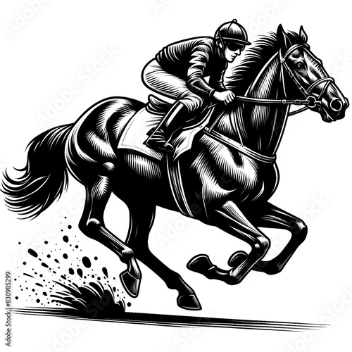 Obraz premium A jockey rides a muscular stallion on a horse race. Black and white illustration