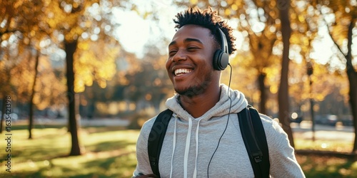 © Soklin, Obraz premium A jogger in a park listening to a podcast while running