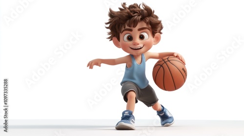 © BerkahStock, Obraz premium A joyful animated boy dribbling a basketball, showcasing energy and enthusiasm for sports.