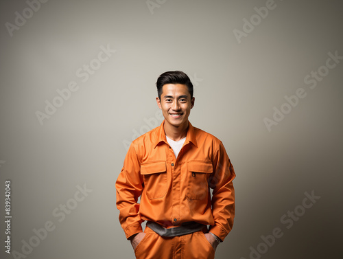 © Store at the corner, Fototapeta premium A joyful Asian man in orange and white clothes against an isolated background