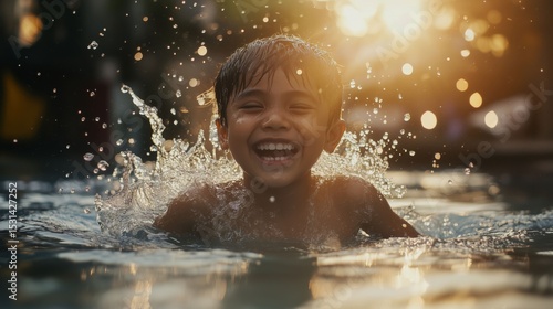 © VladyslavS, Obraz premium A joyful boy splashes in the water in a swimming pool.
