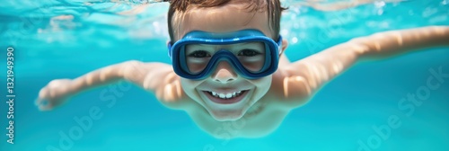 Naklejka premium A joyful boy swims underwater with goggles, showcasing the carefree spirit of childhood and the delight of water play and exploration in a bright blue pool.