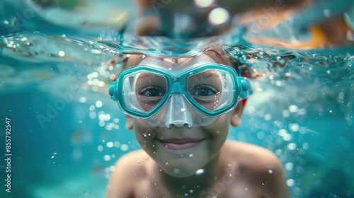 Naklejka premium A joyful boy wearing goggles, partially submerged underwater, captures the...