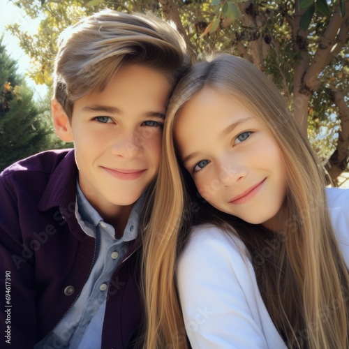 Obraz premium A joyful brother and sister embrace and smile for a delightful outdoor...